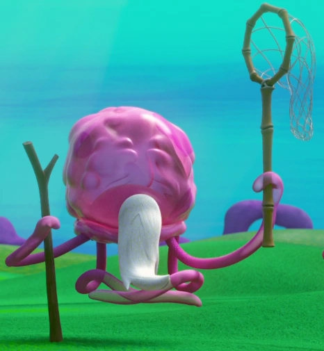 He is an elderly pink jellyfish with a long, white goatee. He holds a stick as a cane.