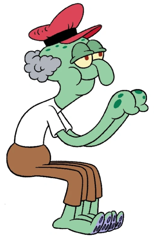 He is an elderly-looking turquoise octopus with green-spotted skin, a droopy nose, gray puffy balding hair, and six arms with lilac suction cups. He wears a white T-shirt, brown pants, and a red cap with a black band.