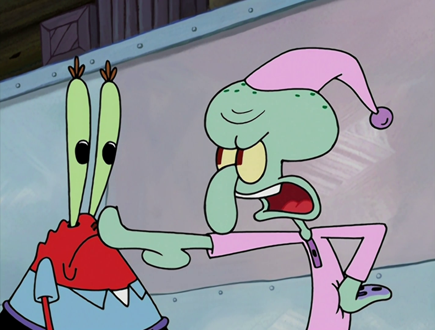 As it all turns out, one of the reasons why Squidward is often arrogant and bad-tempered, especially the fact that he's rude and hateful to most people, is having to put up with SpongeBob and Patrick's loud and irritating behaviors, which sometimes leads him to make plans to get him to stop, although sometimes, either as a result of his arrogance or carelessness, his plans backfire on him. This is shown in "Jellyfishing" where Squidward unleashes a jellyfish in a jar with the intent to make it sting SpongeBob and Patrick, in retaliation for making him get stung by the Queen Jellyfish. In "Fools in April," Squidward pulls a very cruel and harmful prank on SpongeBob that physically assaults him while under the manipulation of a rope tied to him. In "Suction Cup Symphony," Squidward kicks SpongeBob and Patrick out of his window so hard to the point of fracturing the latter's buttock bones. In "Dying for Pie," Squidward buys an explosive pie to give to SpongeBob for Employee Brotherhood Day, oblivious to the fact that it is infused with a bomb; SpongeBob allegedly consumes it, only to reveal toward the ending that he had it in his pocket the whole time to share with Squidward. Although Squidward tried to make the last hours of SpongeBob's life meaningful and felt guilty for causing his doom, he expresses anger upon discovering that SpongeBob never actually ate the pie. In "The Lost Mattress," Squidward tries to get SpongeBob and Patrick eaten by the guard worm at the dump by having them trespass the fence while dressed up in steak suits. In "The Curse of Bikini Bottom," Squidward lends his lawnmower to SpongeBob and Patrick out of hope that they injure themselves with it. In "Sportz?," he creates a malicious sports game for them to play in an attempt to harm them. In "Scavenger Pants," Squidward makes up a really difficult scavenger hunt in hopes of getting SpongeBob and Patrick harmed.