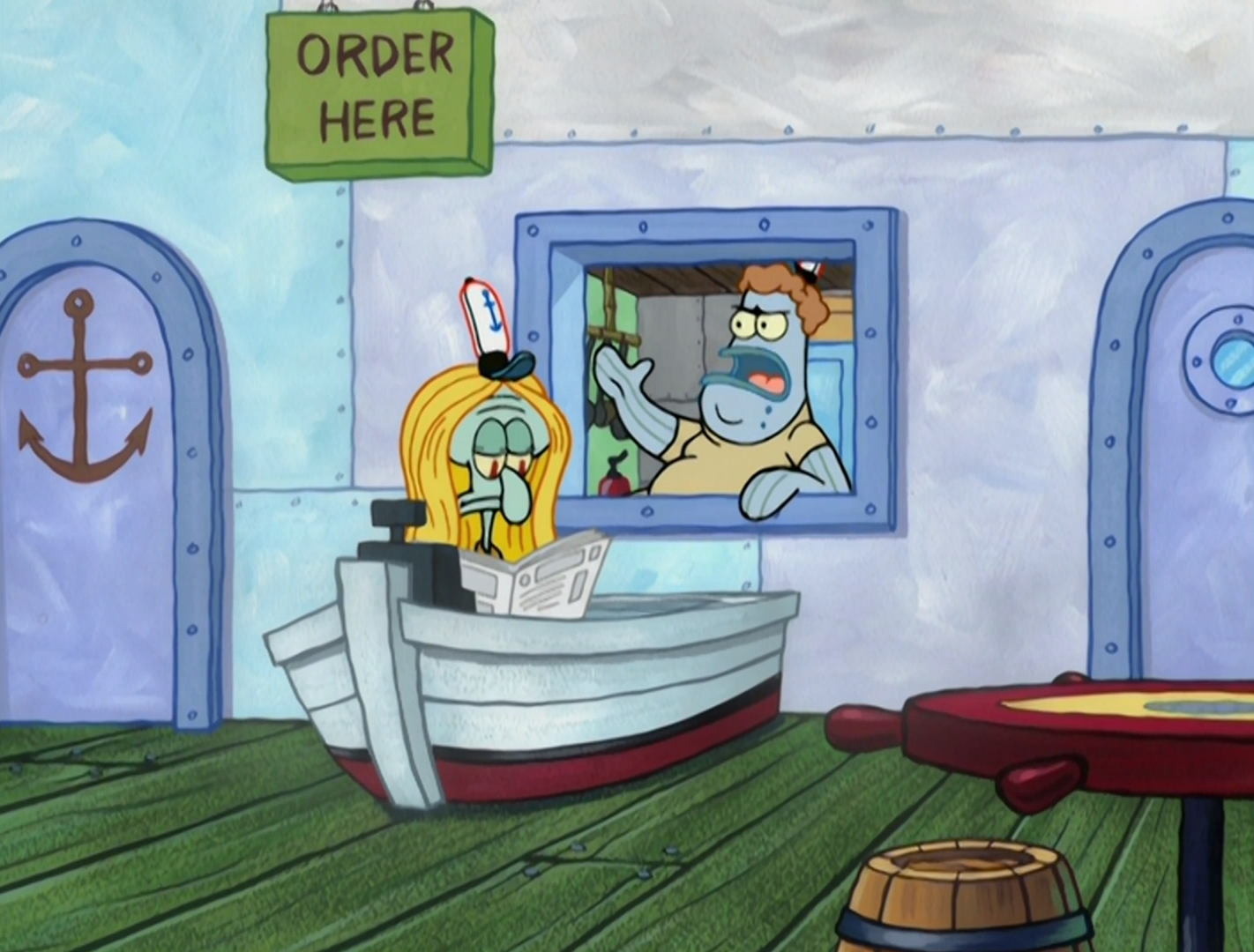 In "Lame and Fortune," he won the most miserable cashier in the Bikini Bottom contest. Unfortunately, Mr. Krabs immediately purloins the cash prize.