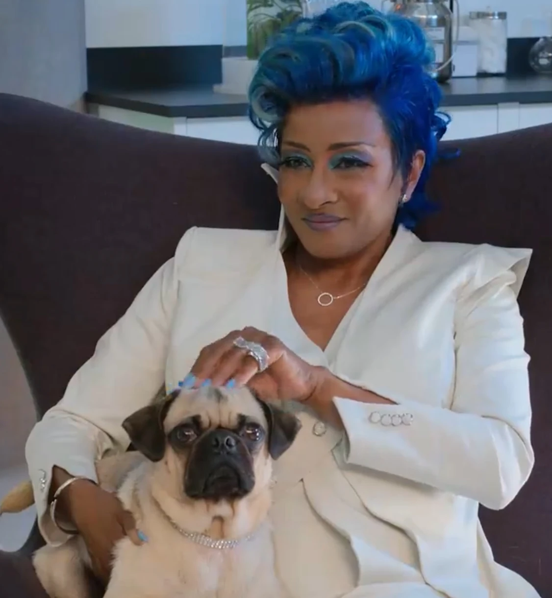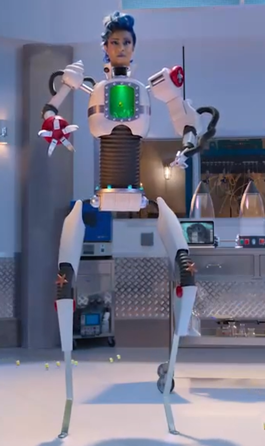 She is a black woman with purple eye makeup and eyelashes with blue hair and pink lips. She also wears a white coat and pants as well. In her form without her clothes, she appears robotic. Her torso has an aquarium in it, with fish on her shoulders and starfish on her knees.