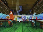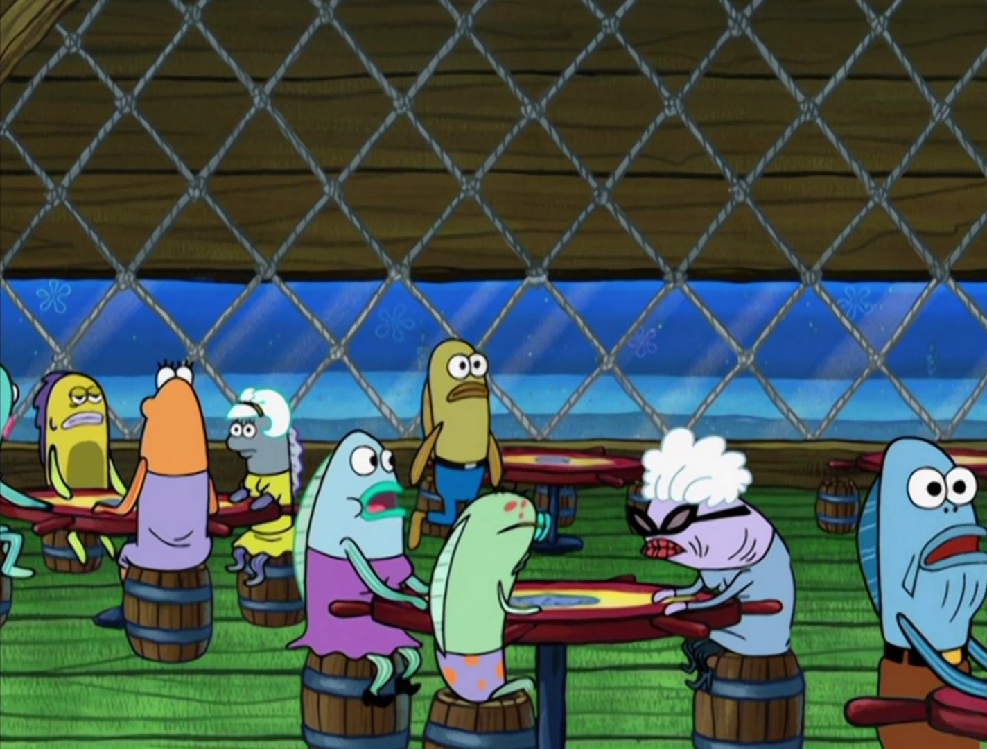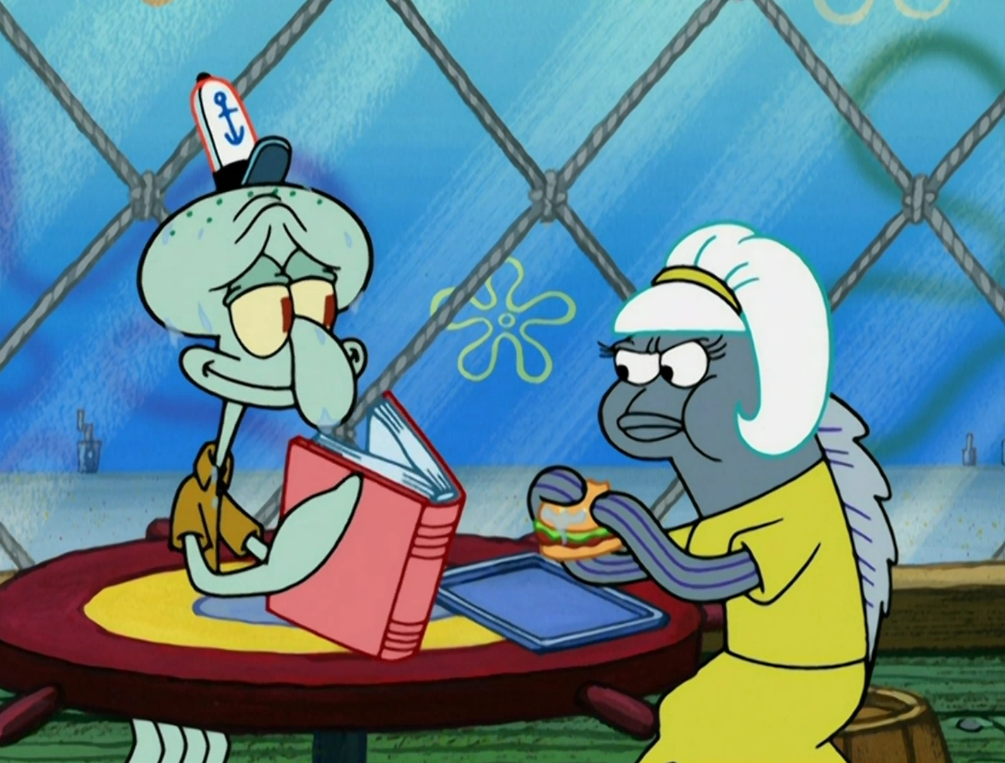 She was one of the customers at the Krusty Krab that constantly made fun of SpongeBob getting kisses from his grandma with Squidward. She is also seen with Squidward at the end of the episode laughing at SpongeBob's crying at Grandma SquarePants' house.