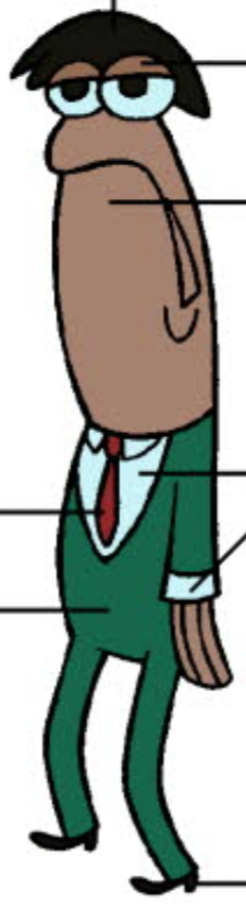 He is a tan-brown anchovy with black bowled hair. He wears a dark green tuxedo, a red necktie, a white shirt, and black shoes. He strongly resembles Teen 2, except Teen 6's hair is slightly different and more crescent-shaped, the sleeves of his tuxedo end in white cuffs, and the fact that his pants and jacket are seemingly conjoined into a full-body suit.