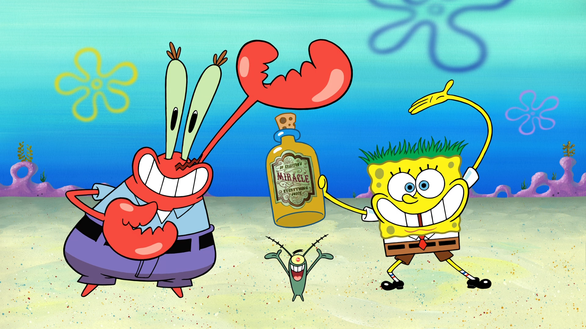 After several days, Mr. Krabs and Plankton fight over how they can use the grease, before SpongeBob tells them that he uses the grease in many different ways and tells them that they can sell it for everything. Mr. Krabs and Plankton form a business selling Dr. Krabton's Miracle Everything Juice, to sell the grease for any way that they can use it. Several Bikini Bottomites drive towards the stand and crash into each other, to which Mr. Krabs and Plankton start to sell Everything Juice, using it for calming babies, gluing hair back to heads and fixing a boat. Mr. Krabs and Plankton quickly gain a fortune as a result.