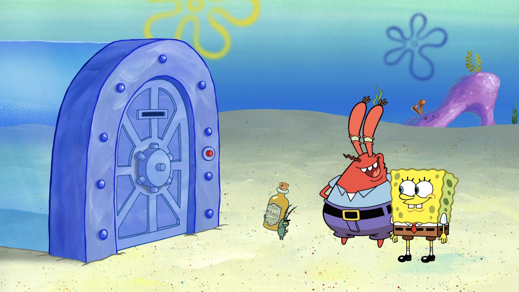 - A sentient framed picture of Mr. Krabs and Plankton can be spotted inside the Dr. Krabton's headquarters next to the elevator where their expression changes from smiling to worried when the angry mob walks out of the elevator.