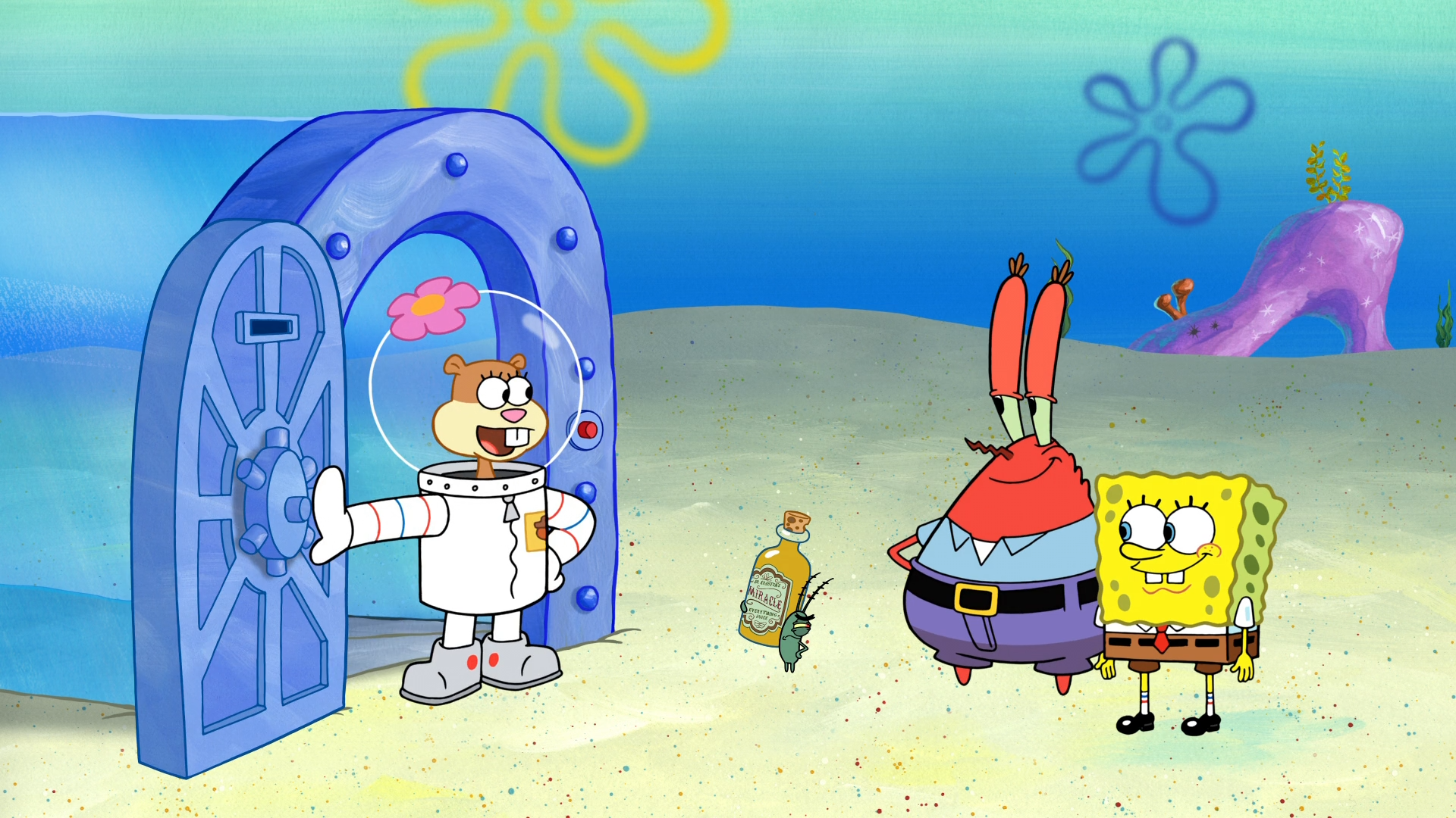 - Right before Sandy opens the door to her treedome, Mr. Krabs starts laughing and his pupils disappear for a split second.