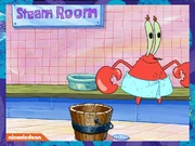As he puts sunscreen on her monitor (to prevent "screenburn"), Plankton catches sight of SpongeBob pushing Mr. Krabs around in a wheelchair. He mutters his plans, but Karen asks, "Who are you denouncing now?" Plankton lies and says the server is late with the hors d'oeuvres. When the server arrives, Plankton takes one of the crackers and gets kelp cheese on his head. Karen, still in a giddy mood, laughs and tells him that the snack is as large as he is. This gives Plankton an idea. Knowing that he will be in trouble if he tries to steal the Krabby Patty in front of Karen, he sculpts the cheese into his likeness and sneaks off. After being crushed underneath the wheelchair, he returns to his lounge chair, where Karen wakes up from sleep mode. When he sees them again, he massages her wheels, causing her to fall asleep again. Then, he follows Mr. Krabs and SpongeBob into the steam room, hiding in a bucket of water. However, a large and sweaty fish named Bubble Bust comes along, gets a ladleful of water (and Plankton), and pours it onto his back. Plankton screams as he slides down Bubble Bust's back and into his speedo. When SpongeBob and Mr. Krabs are playing shuffleboard, Plankton hides under a puck, but is soon flung away when Mr. Krabs hits the puck he was hiding under. When Mr. Krabs is on water skis, Plankton attempts to cut the rope that keeps him attached to the cruise ship, but he falls overboard and into the ship's propellers, which slice him up. Plankton climbs back on board, lifting his severed lower half up after him, and gives up stealing the recipe.