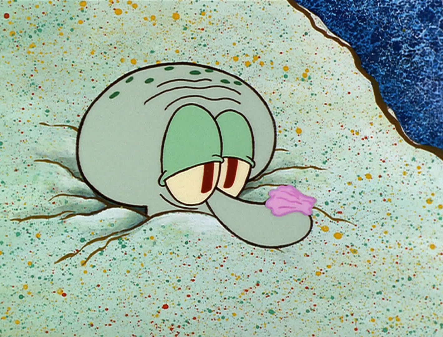 海綿寶寶用力吹沙子,吹出了貝殼